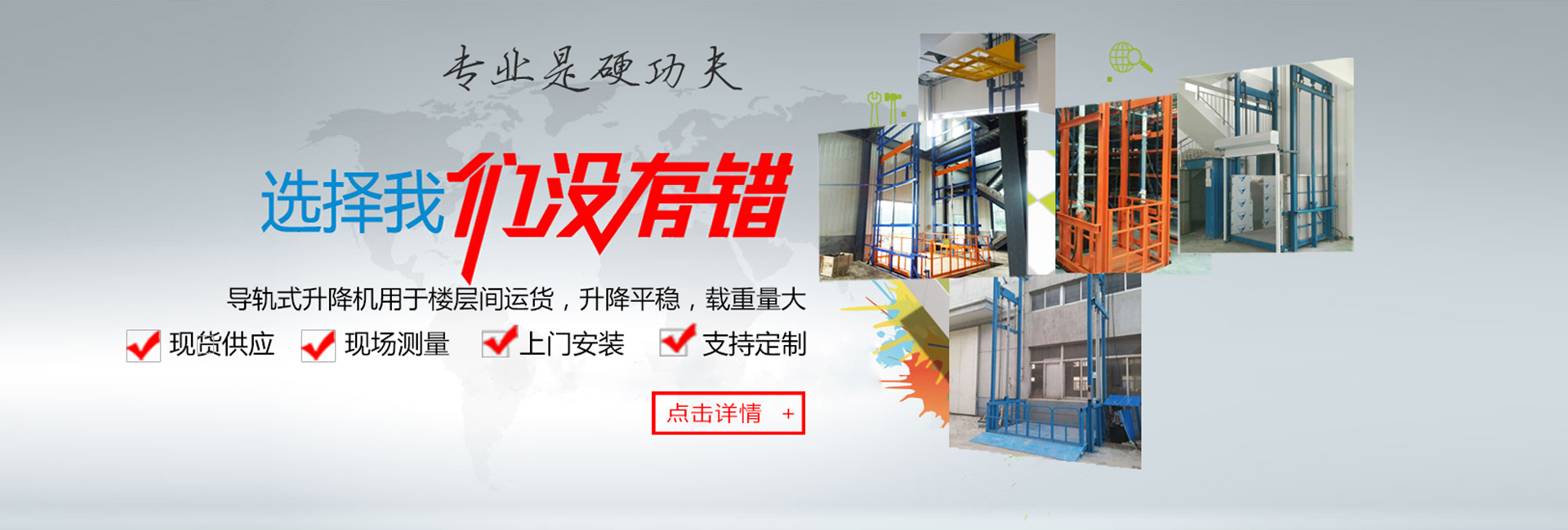 濟南強森升降機械有限公司是專業(yè)的液壓貨梯專業(yè)生產(chǎn)廠家, 主導產(chǎn)品為:SJY系列貨梯、固定式液壓升降貨梯、導軌式貨梯、導軌式升降機、登車橋、移動式升降機、大噸位貨梯等各種特殊產(chǎn)品,廣泛用于建筑內(nèi)外裝修、車間、車站、商店、大廳、路燈、物流裝卸、工業(yè)流水線、高速公路等各行各業(yè)。售后服務鄭重承諾:·公司承諾設備免費保修期一年,終身維護。設備保修期過后,只收取零部件及維修成本費·設備到現(xiàn)場后,由經(jīng)驗豐富的專業(yè)技術人員對設備進行免費調(diào)試并負責培訓設...